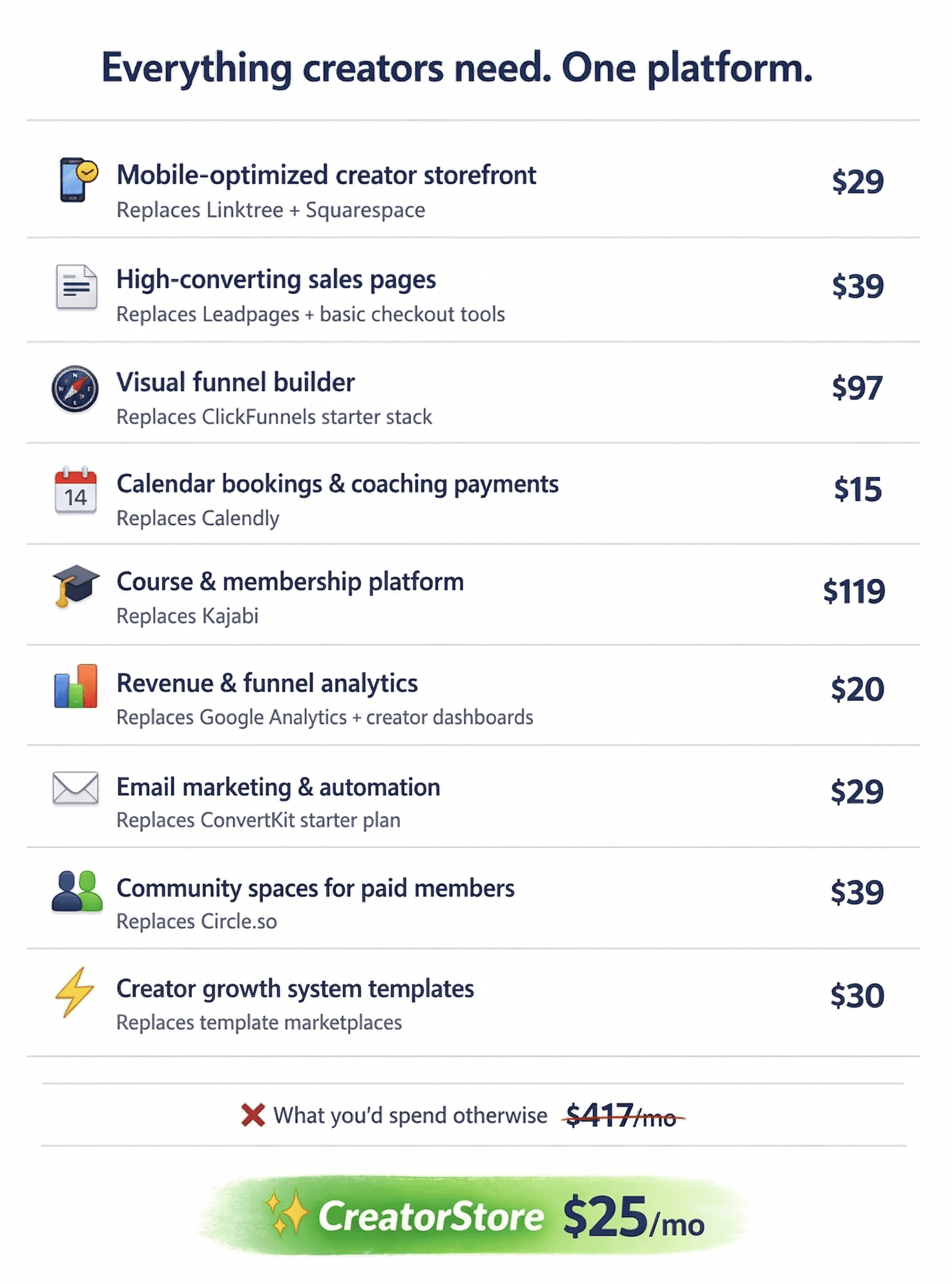 No more paying for 8+ different apps just to run your business. CreatorStore brings everything together so you can launch faster, sell more, and keep more revenue.